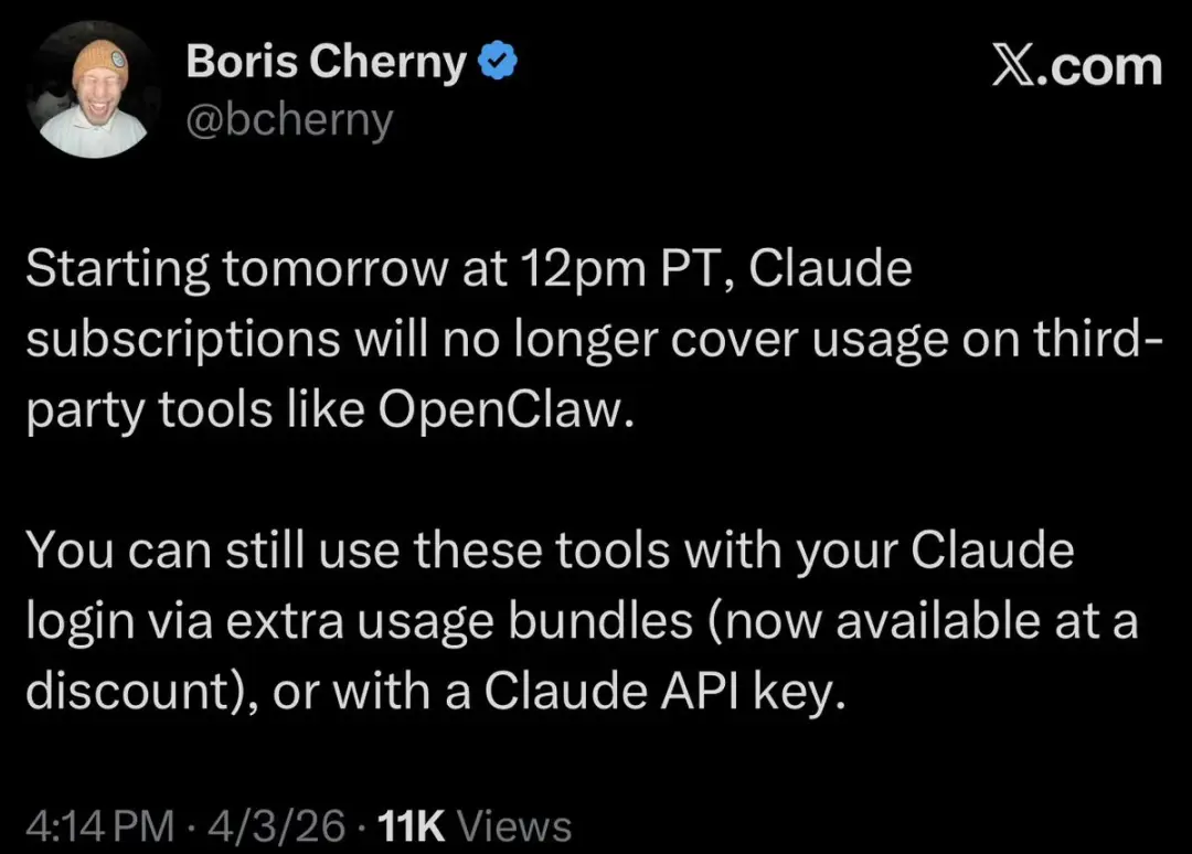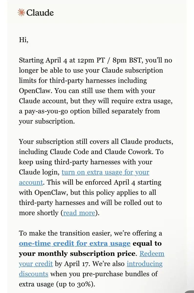 之前花20美元月费就能通过OpenClaw无限调用Claude的日子,到此结束。